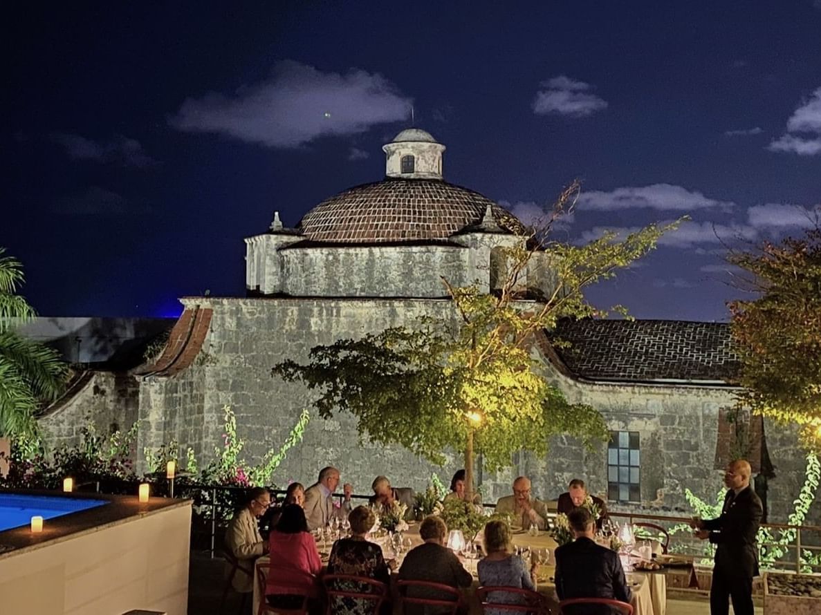 Disfruta de la elegancia colonial rodeado de columnas de 450 años en un ambiente único y sofisticado para desayuno, almuerzo o cena.